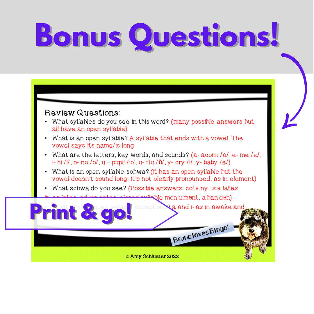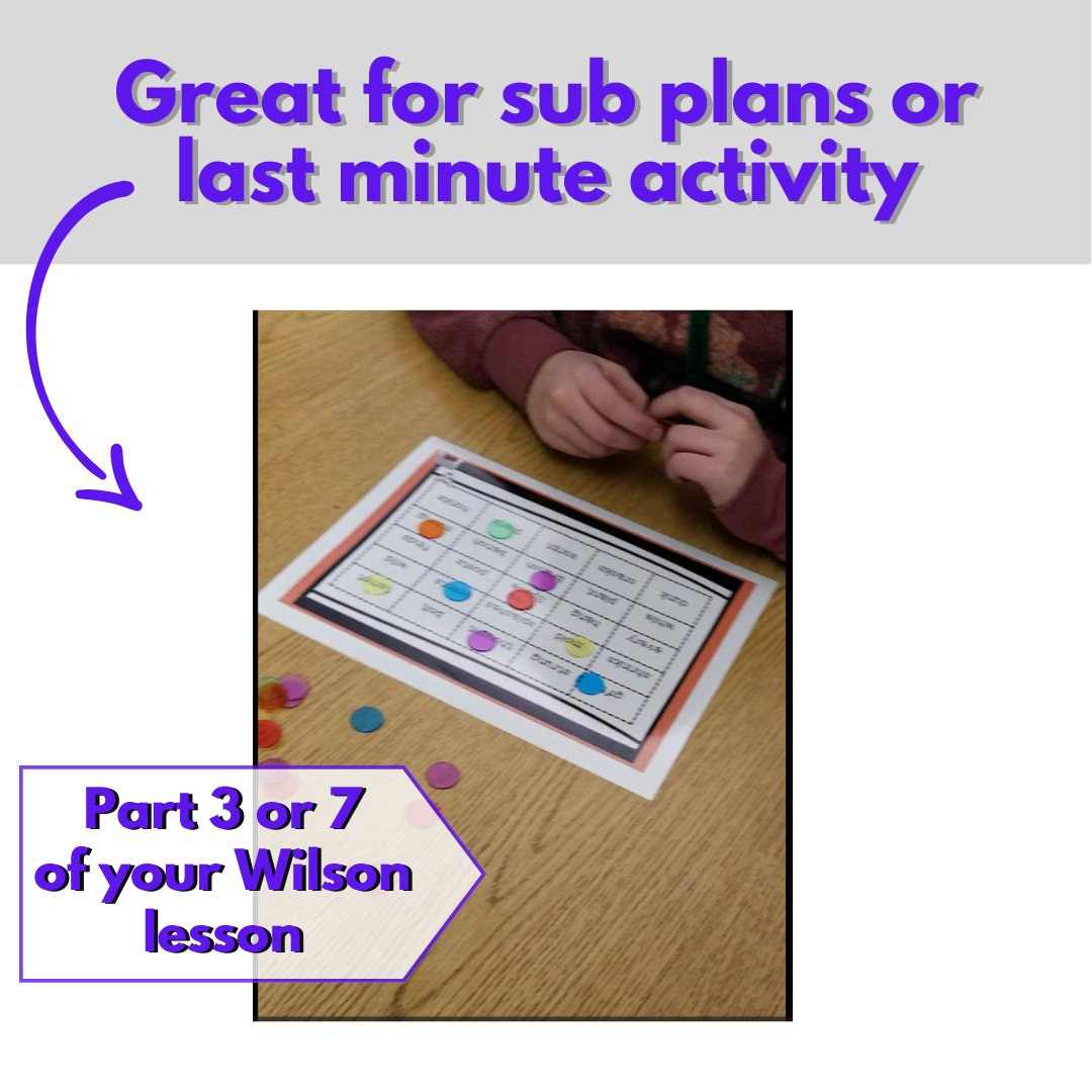 Are you looking for a fun, no prep Wilson Reading System aligned Bingo game bundle for Step 1-6 (4 syllable types- closed, open, v_e, and final stable, plus much more)? These review games add lots of effortless fun to your lessons. Just print & go– it’s that easy!